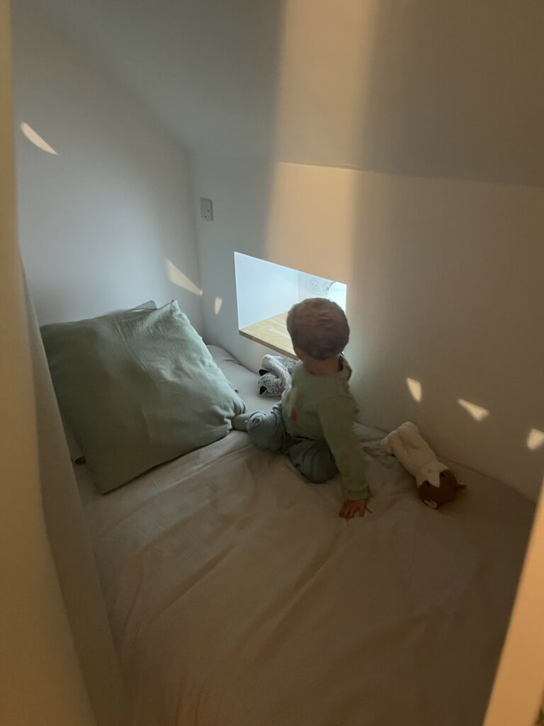 - Côté enfant, un adorable lit cabane douillet, avec un vrai sommier et matelas : Gaston a adoré son petit nid !