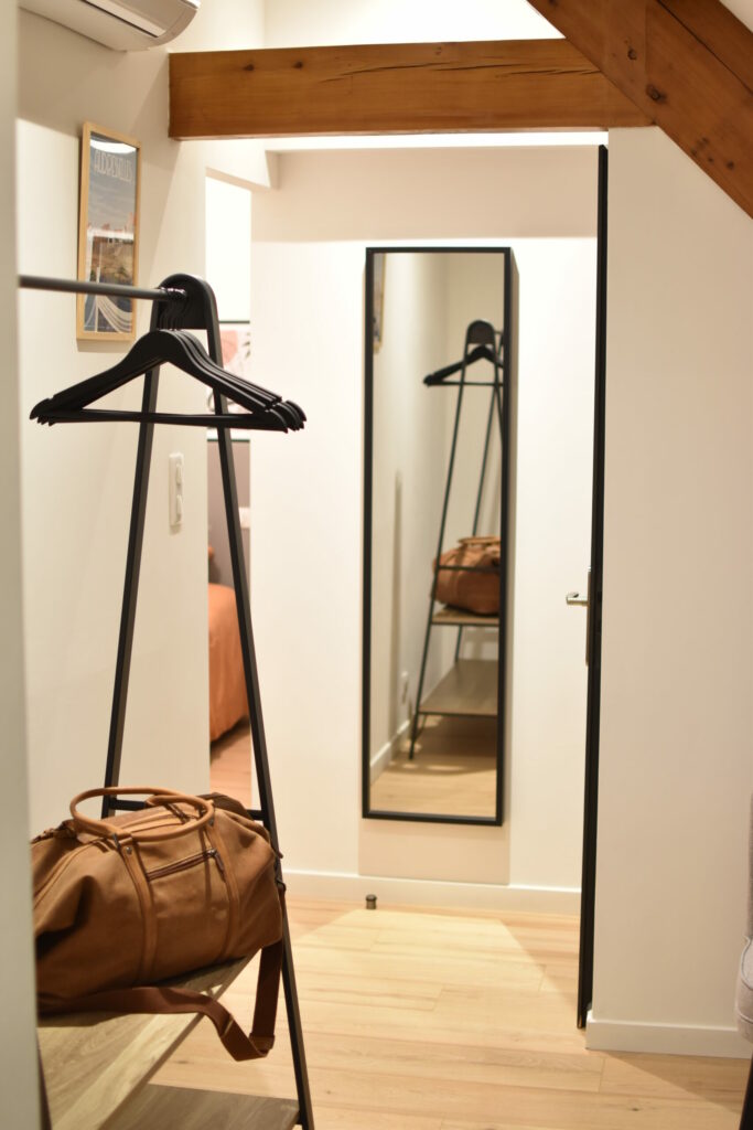 - Et bien sûr, des toilettes séparés et une penderie pratique pour ranger ses affaires. Toujours avec le charme des poutres apparentes.