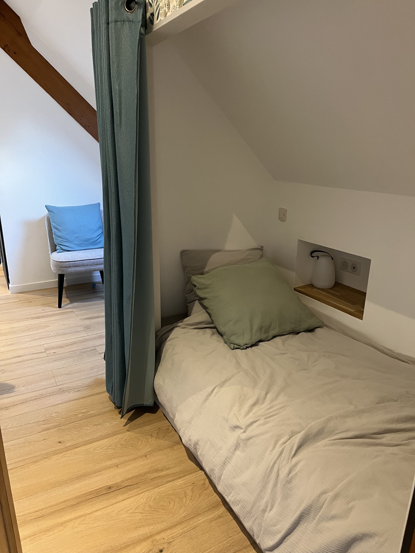- Côté enfant, un adorable lit cabane douillet, avec un vrai sommier et matelas : Gaston a adoré son petit nid !